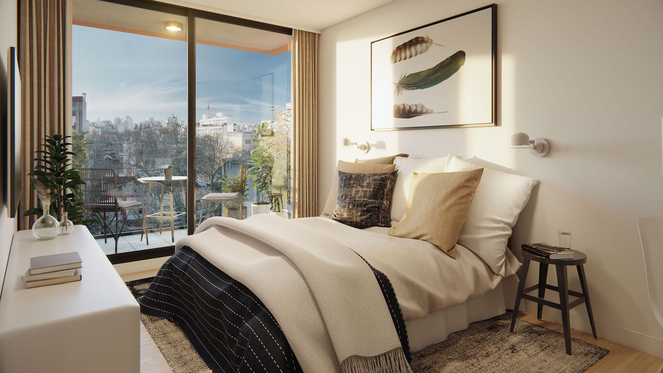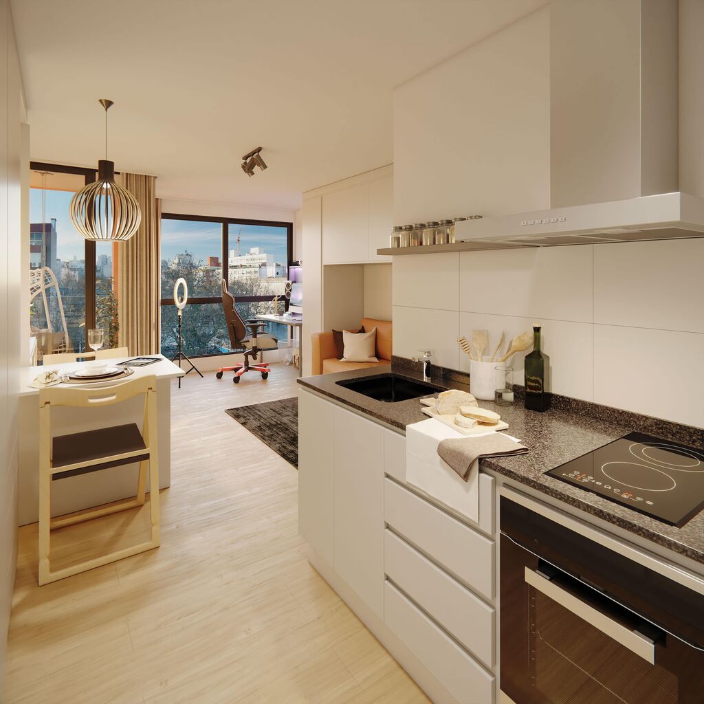 Las unidades contarán con Kit de domótica: para control de iluminación, de cortinas y cerraduras electrónicas, espacio exterior y amoblamientos flex para usos mixtos en monoambientes.