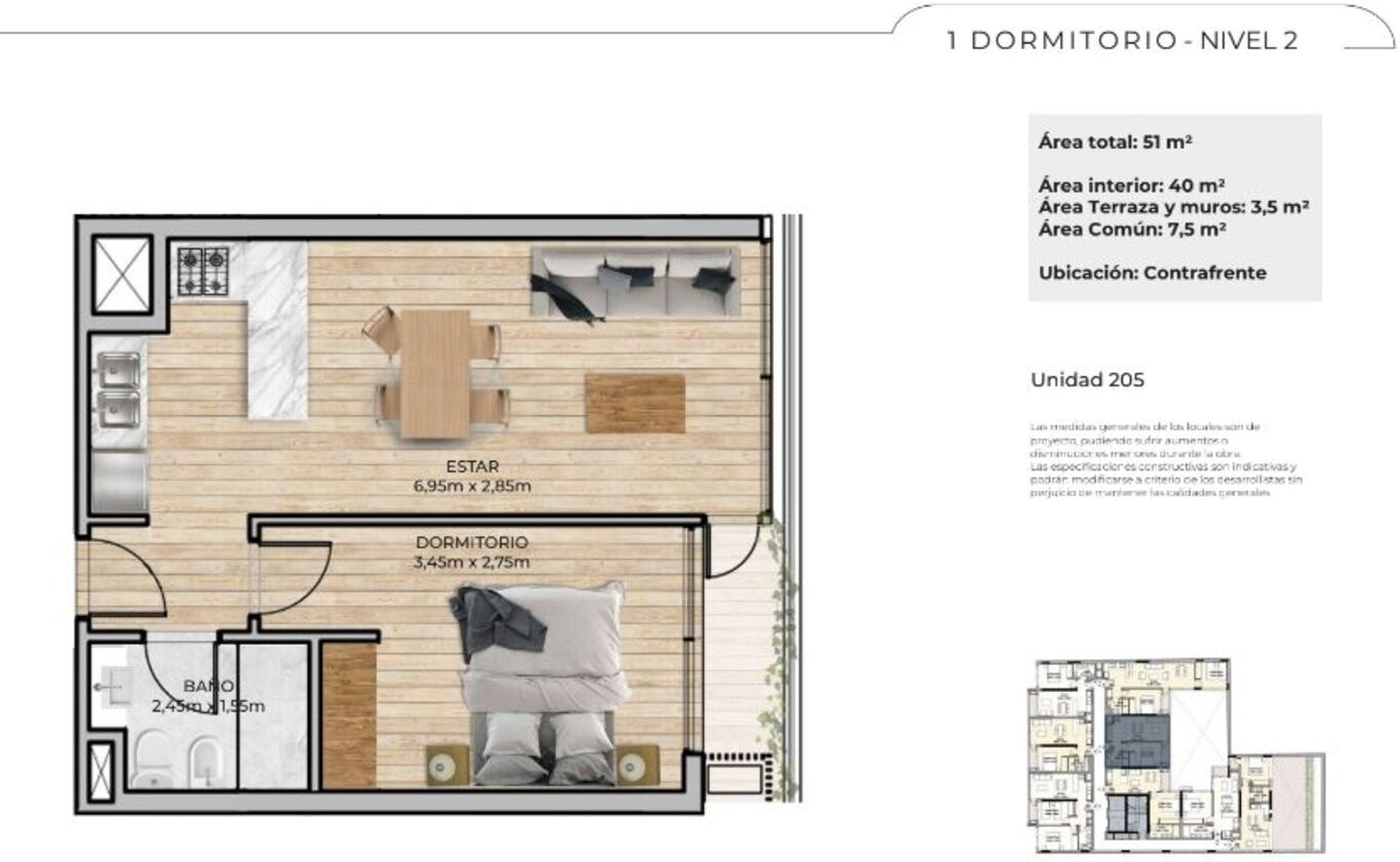 Todas las unidades se entregarán con Anafe, termotanque, horno eléctrico, luminaria y placares en el dormitorio.