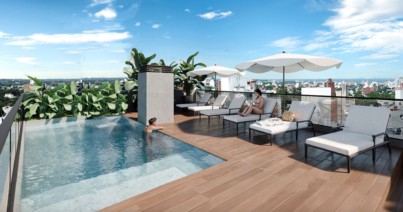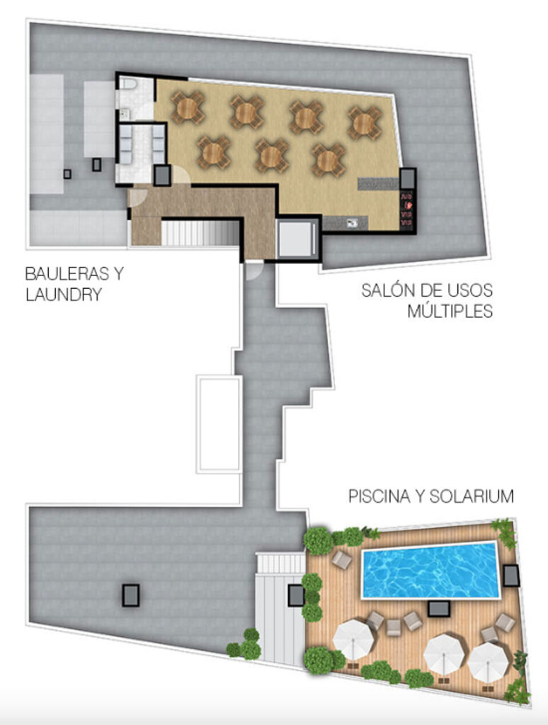Planta de amenidades completamente equipada, con salón de usos múltiples, barbacoa, solarium y piscina.