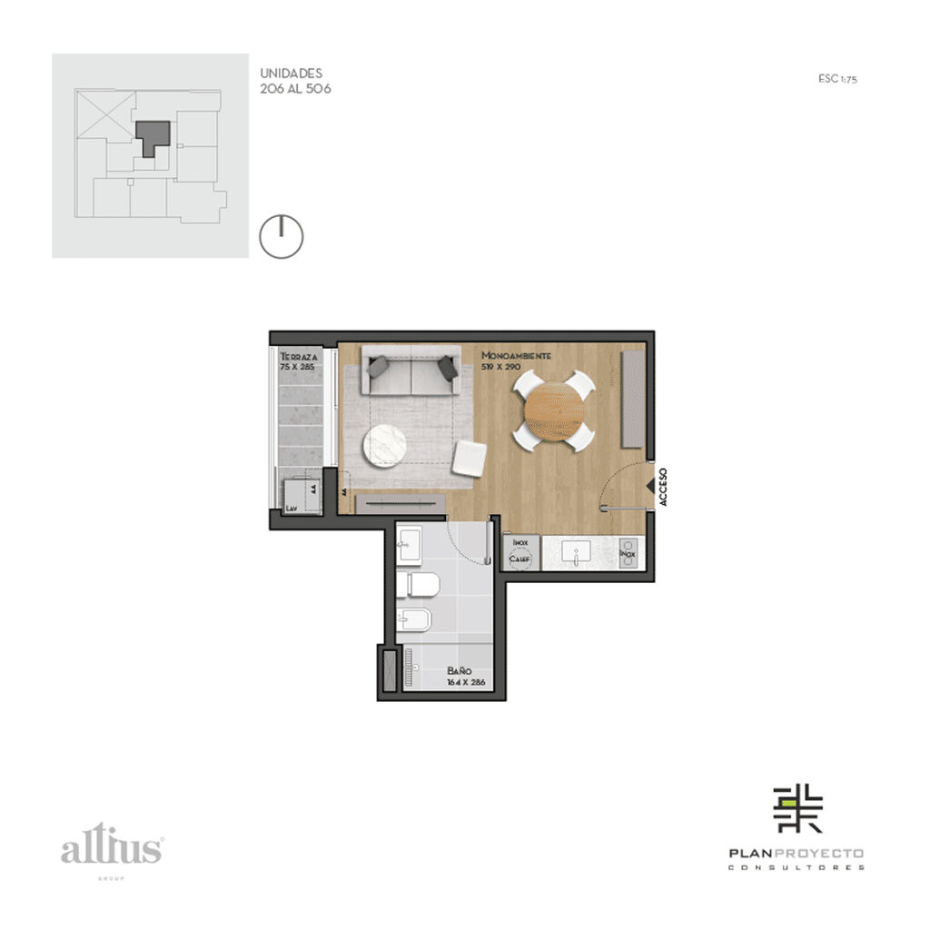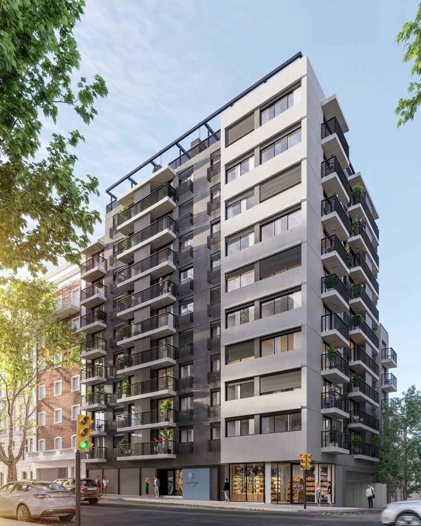 Diseñado por Estudio Plan Proyecto Consultores, el edificio se compone de una torre de 10 niveles con 75 apartamentos de tipologías monoambiente, 1, 2 y 3 dormitorios, además de estacionamientos y locales comerciales.