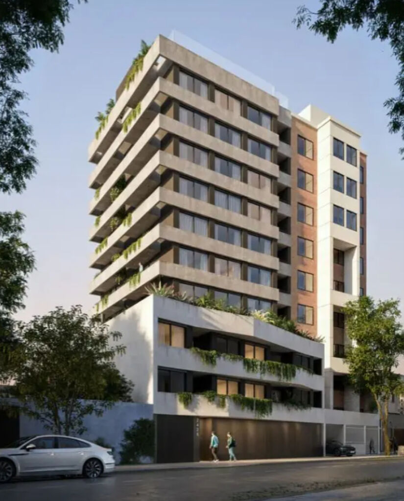 El edificio se desarrolla en 10 niveles con un total de 44 unidades, que incluyen monoambientes y apartamentos de 1, 2 y 3 dormitorios, diseñados para aprovechar al máximo la luz natural y los espacios exteriores, con vistas despejadas al este, norte y oeste.