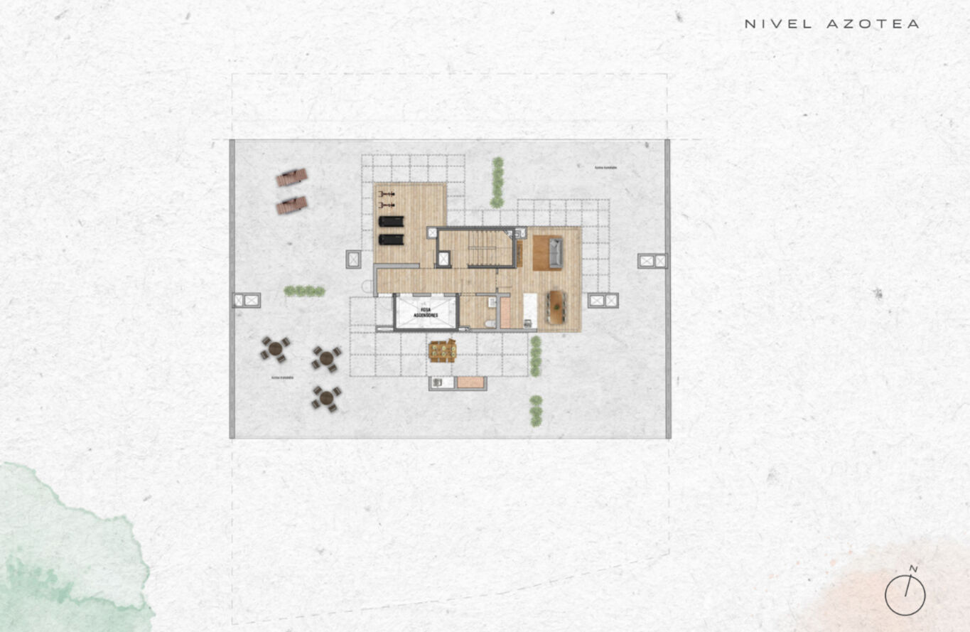 Cielorrasos de hormigón visto en áreas principales y terrazas; cielorrasos de yeso en zonas de servicios.