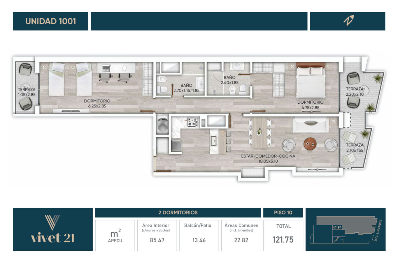 En Vivet 21 encontrás lo que realmente importa al elegir tu próximo lugar para vivir o trabajar: calidad y una ubicación excepcional sobre la vibrante avenida 21 de Setiembre, en el corazón de Punta Carretas. Rodeado de servicios, gastronomía, comercios y espacios verdes, tu día a día se llena de comodidad y energía.Este apartamento ofrece una propuesta moderna y funcional, pensada para el estilo de vida actual. Ambientes versátiles, amplia iluminación y ventilación natural, y una terraza protagonista que integra interior y exterior para disfrutar al máximo.