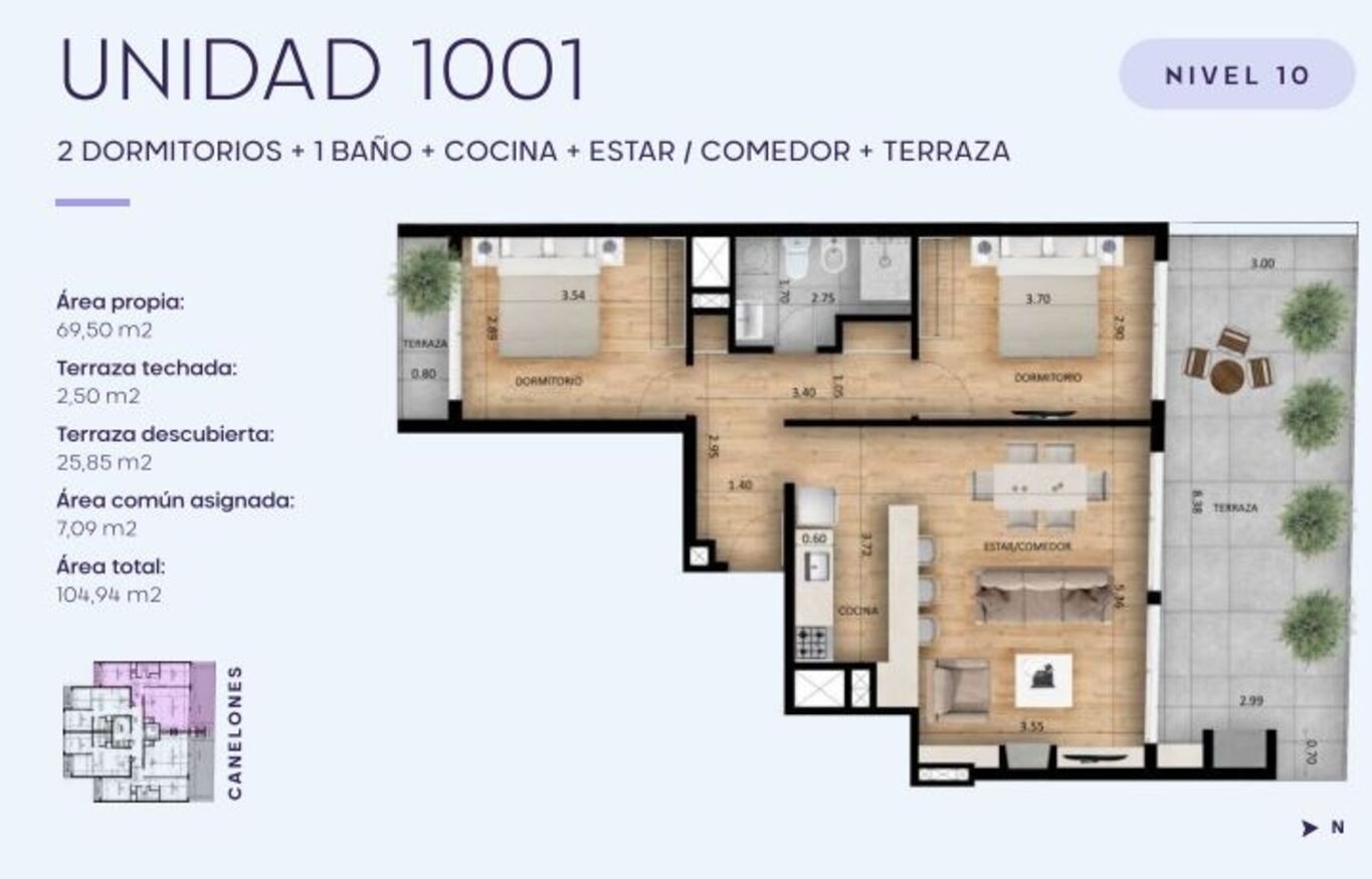 El proyecto está ubicado en la calle Canelones. cuenta con 16 unidades monoambiente dispuestas entre el nivel 01 y el nivel 04, 47 unidades de 1 dormitorio desarrolladas entre el nivel 01 y nivel 10, y 2 unidades de 2 dormitorios en nivel 10 frentistas, todas las unidades del edificio cuentan con terrazas de uso exclusivo.