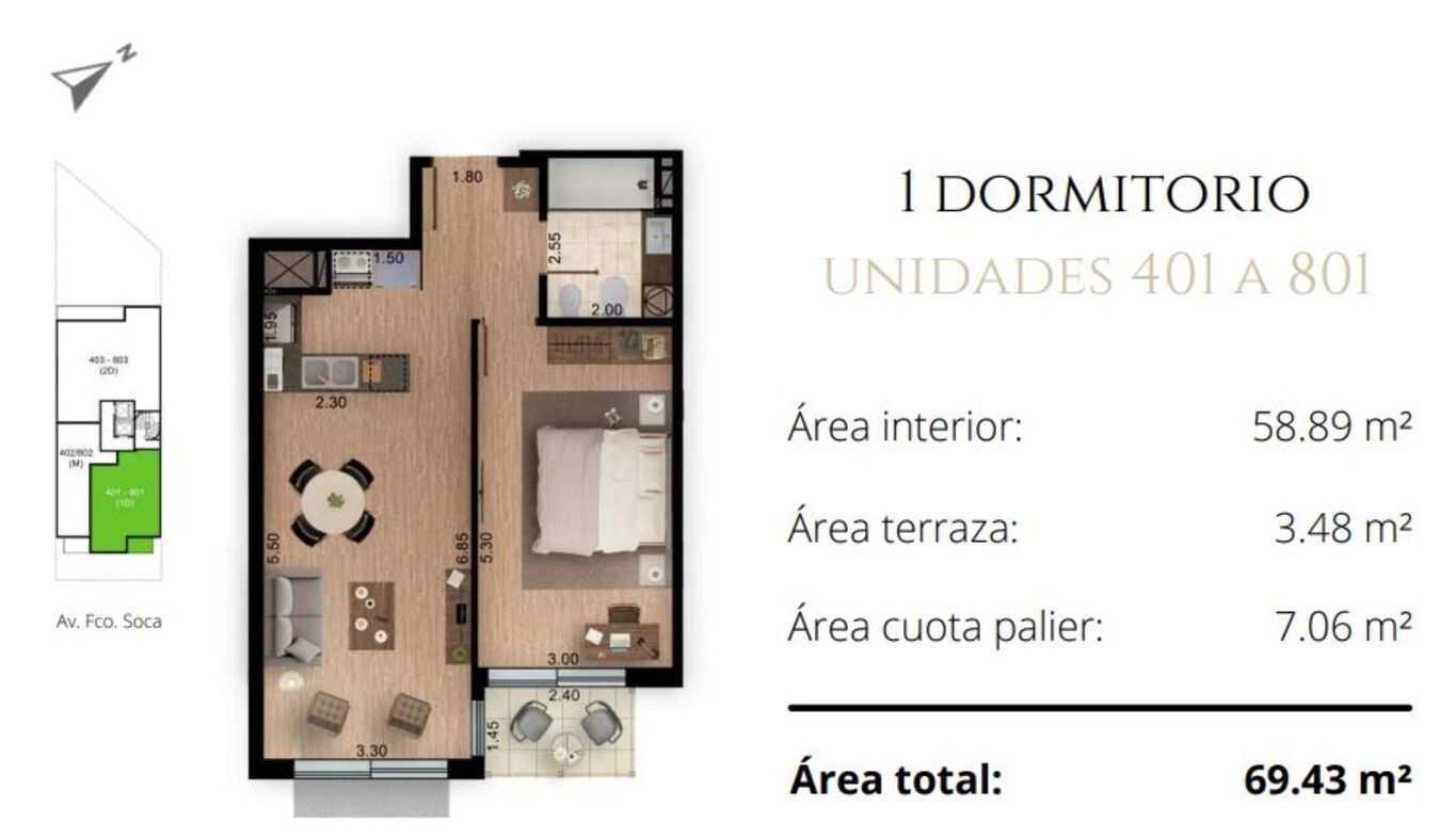Este loft es septimo piso al frente y cuenta con una terraza de 3,48m2.