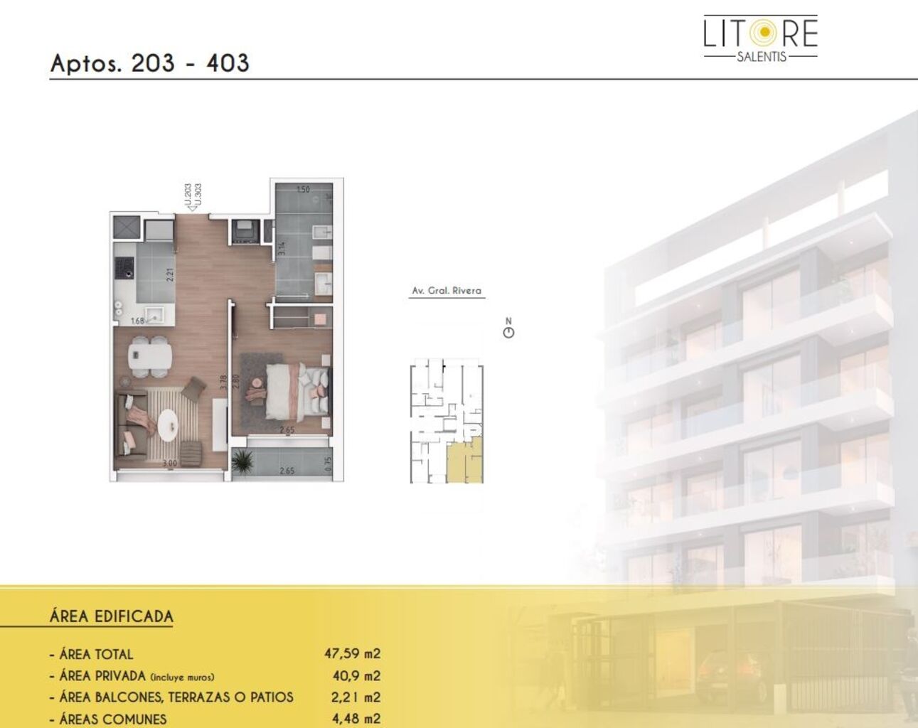 Salentis Litore es un proyecto exclusivo que se desarrolla en una torre de 4 pisos, con un total de 16 apartamentos de diseño contemporáneo y materiales de excelente calidad. Las unidades, que incluyen monoambientes, de 1 y 2 dormitorios, destacan por sus amplios espacios y vistas despejadas. Cada apartamento cuenta con terraza o patio exclusivo, ofreciendo un entorno privado y cómodo para sus residentes.El edificio ha sido diseñado pensando en el confort y la funcionalidad. Las unidades estarán equipadas con ventanales de doble vidrio hermético, lo que garantiza un excelente aislamiento térmico y acústico, persianas eléctricas y previsión para instalación de aire acondicionado, asegurando una experiencia de vida de alta calidad en todo momento.