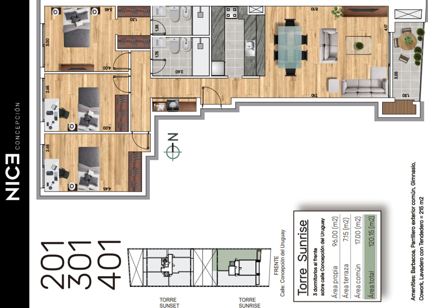 Nice Concepción se encuentra en Av. Concepción del Uruguay, a solo unos pasos de Rivera y a pocas cuadras de la Rambla de Malvín. El proyecto ofrece apartamentos monoambientes, de 1, 2 y 3 dormitorios en un edificio moderno y funcional, compuesto por dos torres de 5 niveles cada una, con un total de 42 apartamentos y 24 garajes. Las unidades son luminosas y cuentan con terminaciones de primer nivel.En el último piso, el edificio dispone de varios amenities, entre los que se destacan una barbacoa con parrillero, un salón de usos múltiples, gimnasio y lavandería.