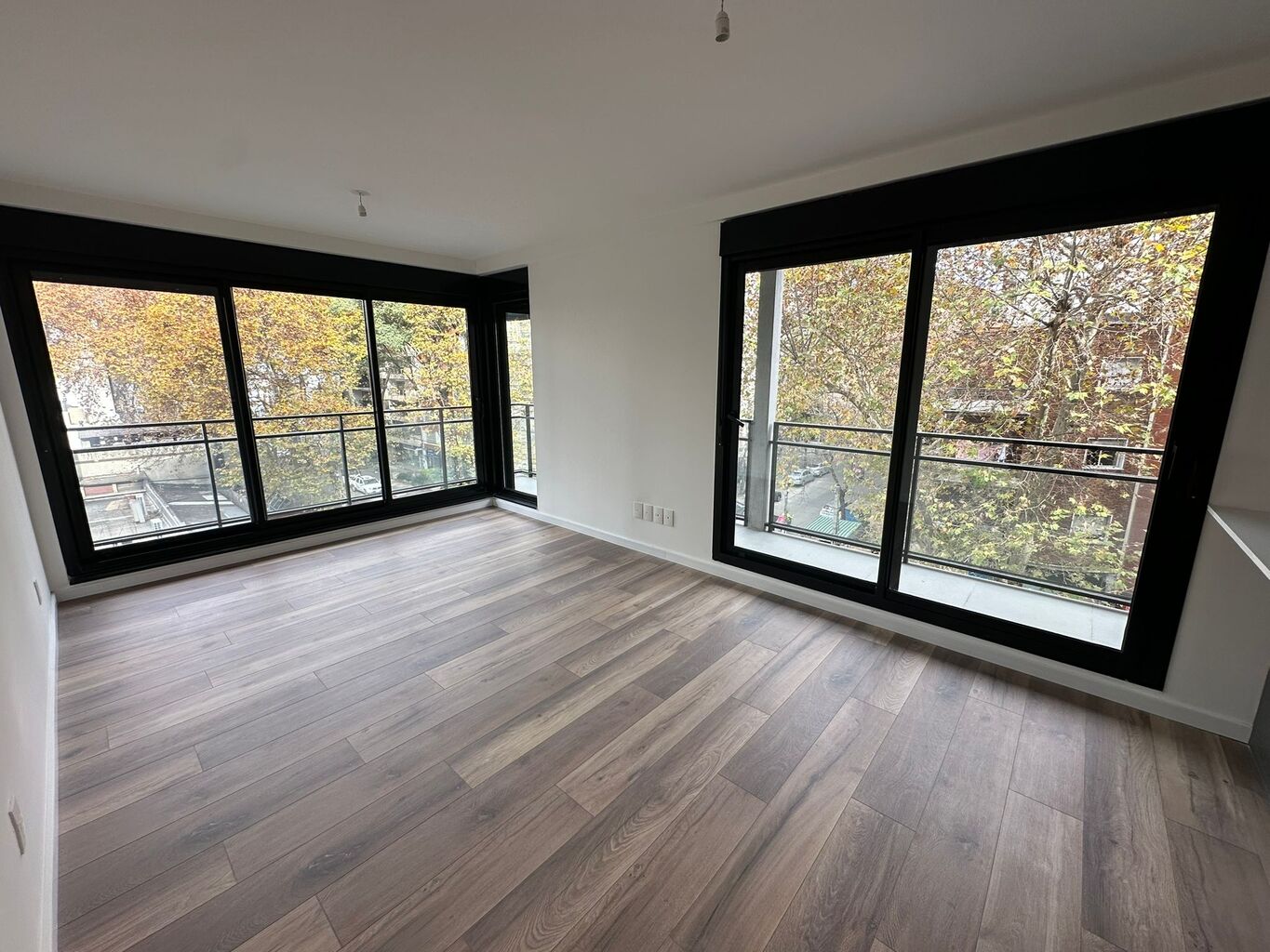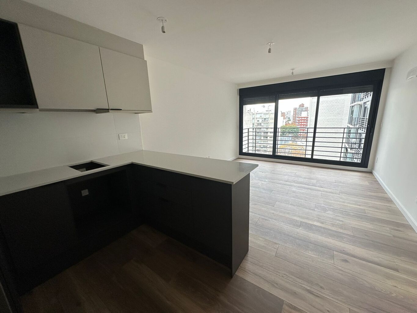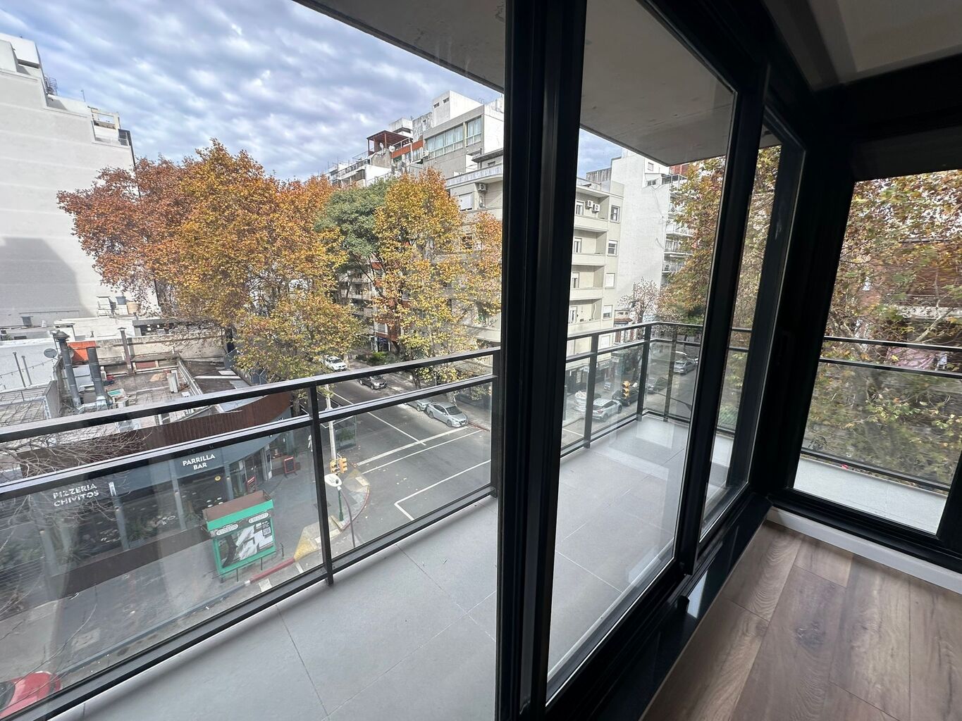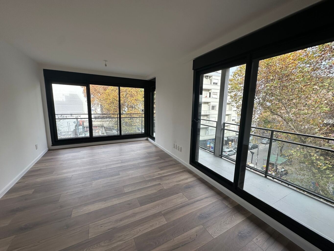 Todas las unidades disponen de un balcón exterior, revestido en porcelanato gris mate, con desagüe pluvial y baranda de aluminio con cerramiento de vidrio.