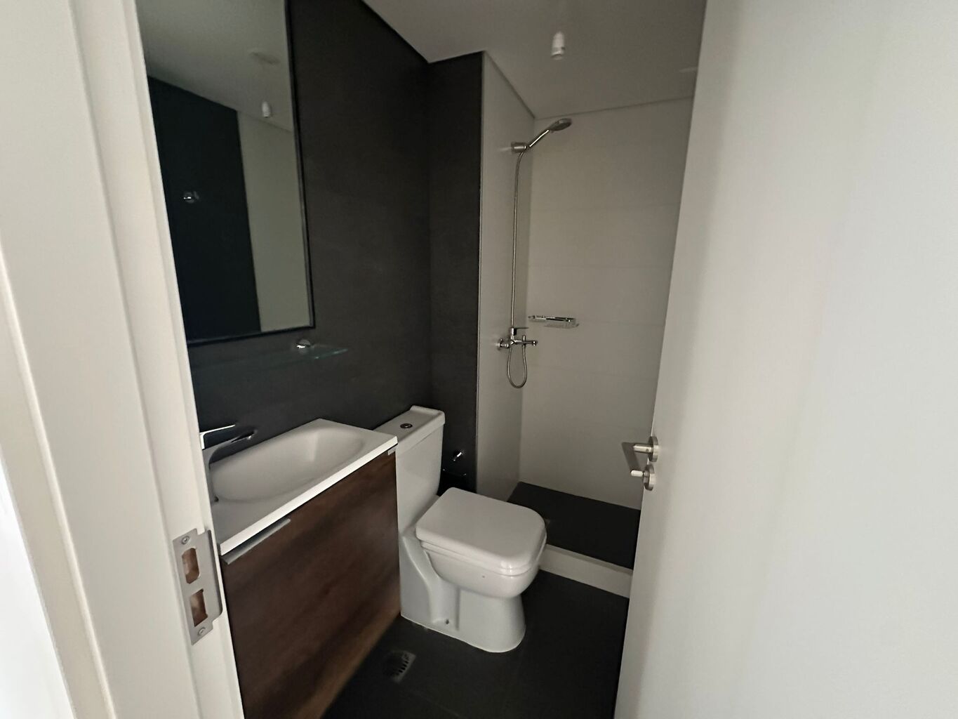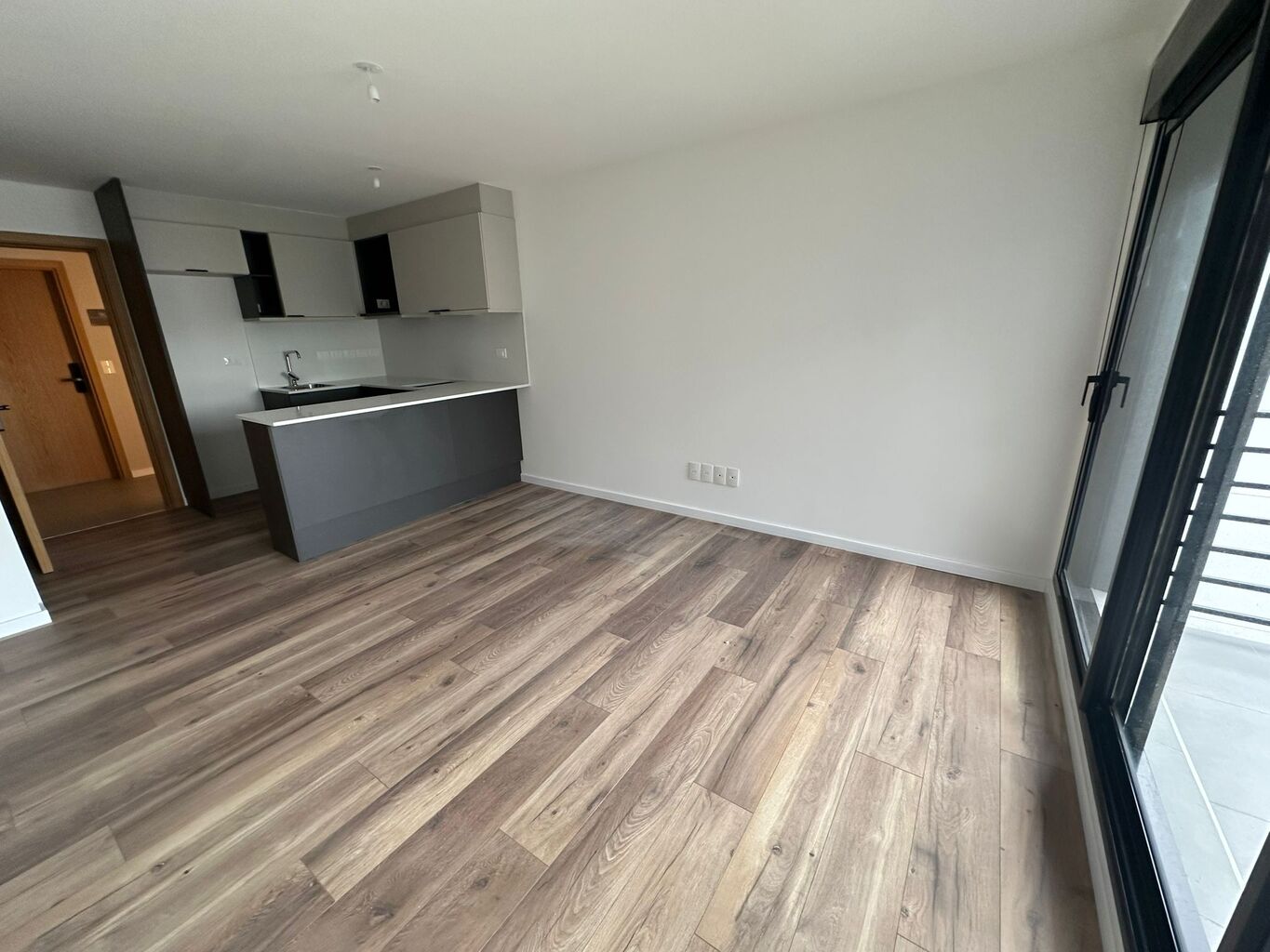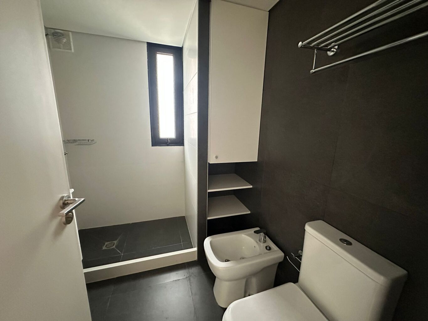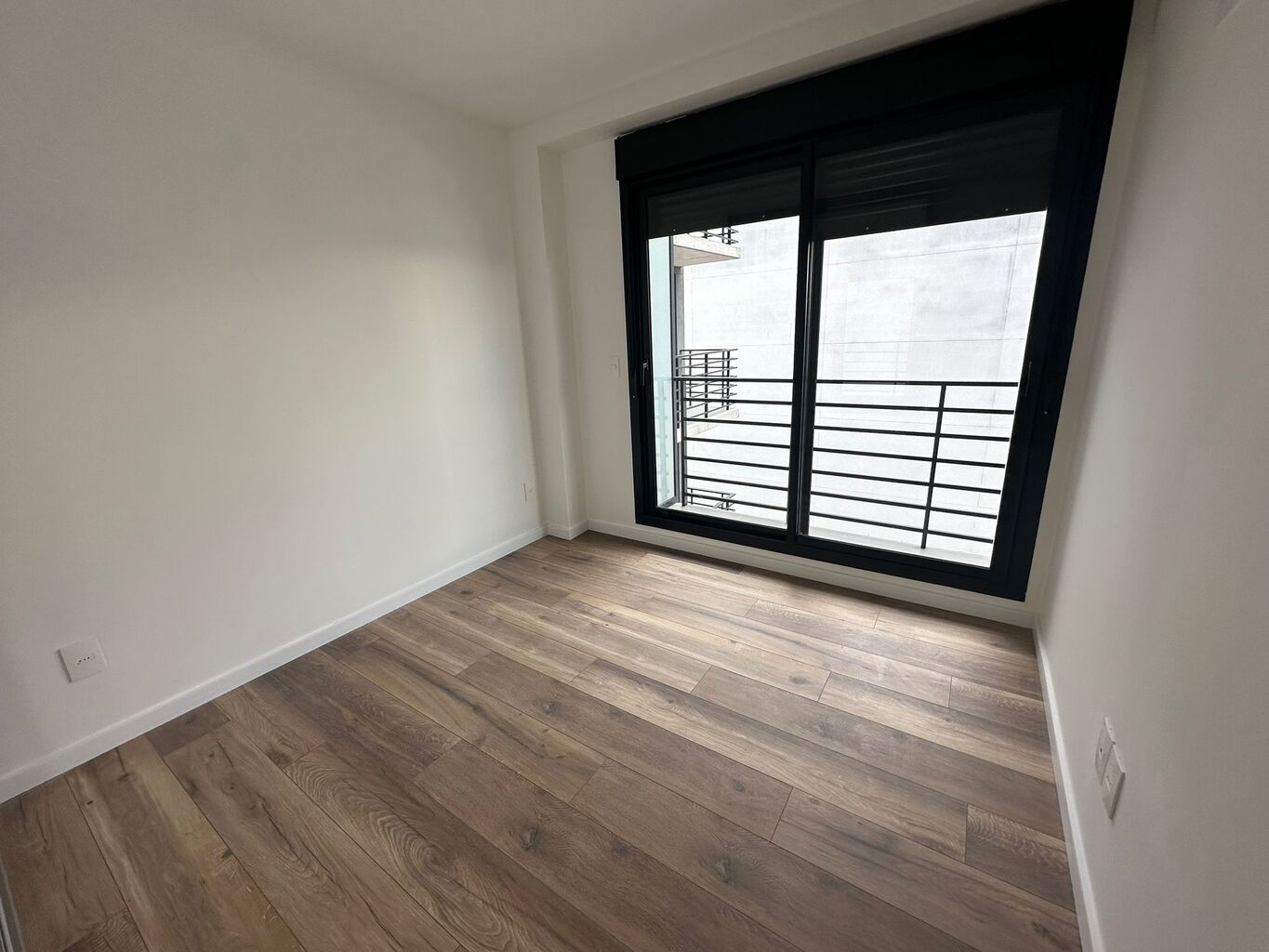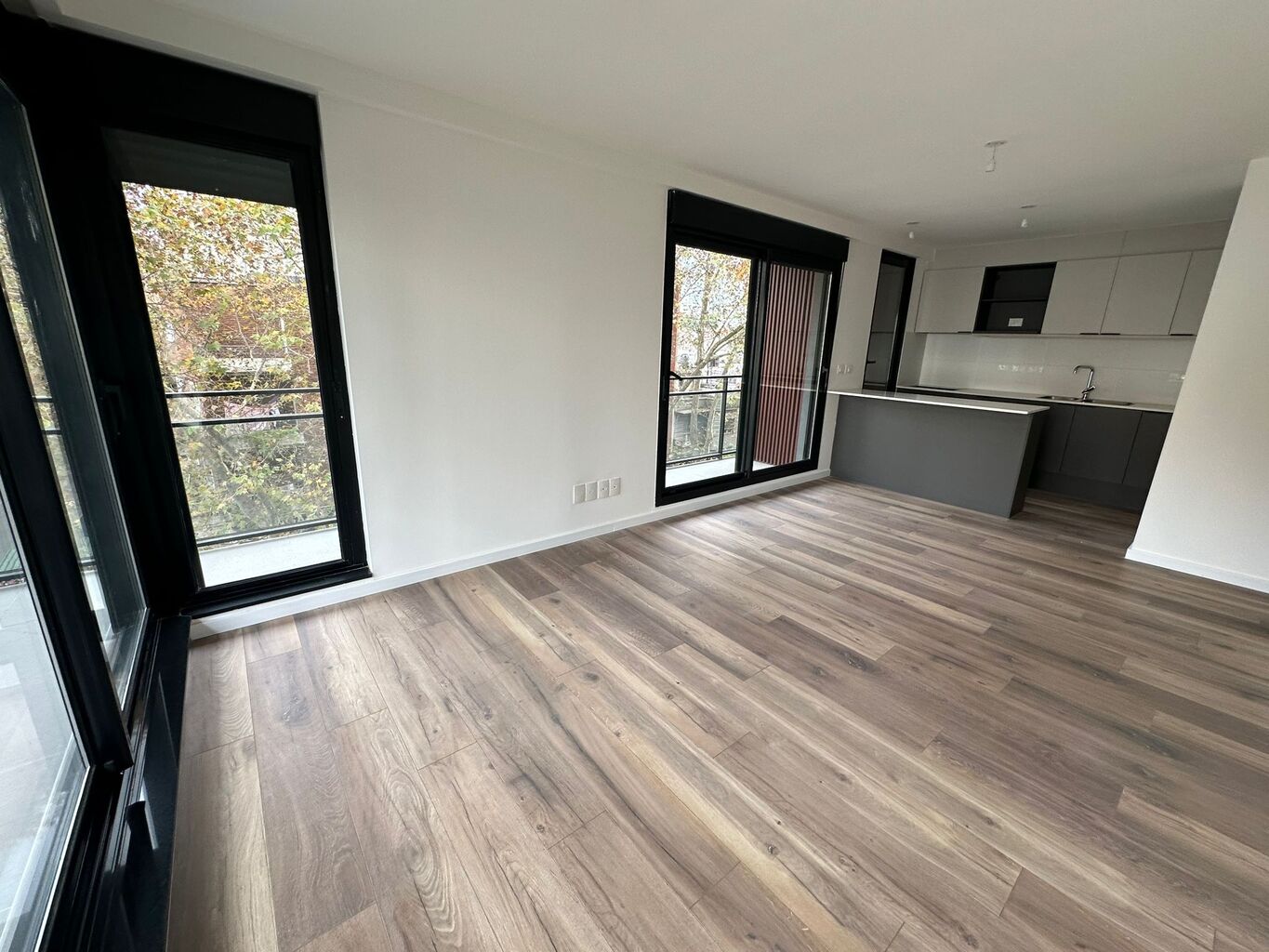 Todas las unidades disponen de un balcón exterior, revestido en porcelanato gris mate, con desagüe pluvial y baranda de aluminio con cerramiento de vidrio.