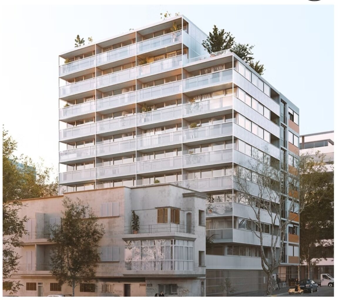 El edificio realiza un giro de 90 grados orientando su fachada principal hacia el Rio de la Plata sin desatender la continuidad con el entorno urbano inmediato. A través de un sistema circulatorio de pasarelas que ventilan a un patio interior se organizan 39 unidades.